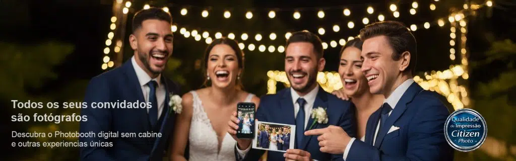 O myPhonePrint não precisa de cabine — os convidados usam o próprio telemóvel para participar. É mais moderno, ocupa menos espaço e permite participação simultânea de todos os convidados.
