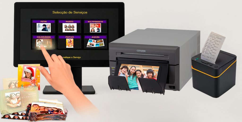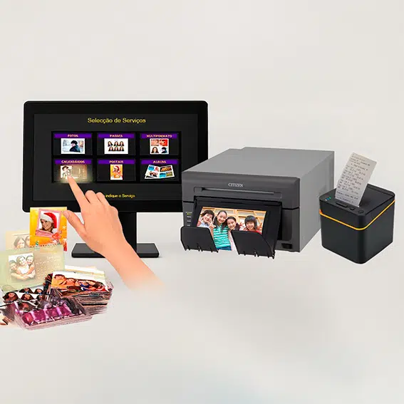 Kiosk fotográfico myKIOSK 22 Pro com impressora Citizen CX-02, 1 caixa de papel e sistema de tickets com controlo de impressão por código.
